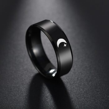 Un anillo negro con un diseño de luna, evocando un aura misteriosa y celestial. Ideal para quienes buscan una pieza de joyería única.