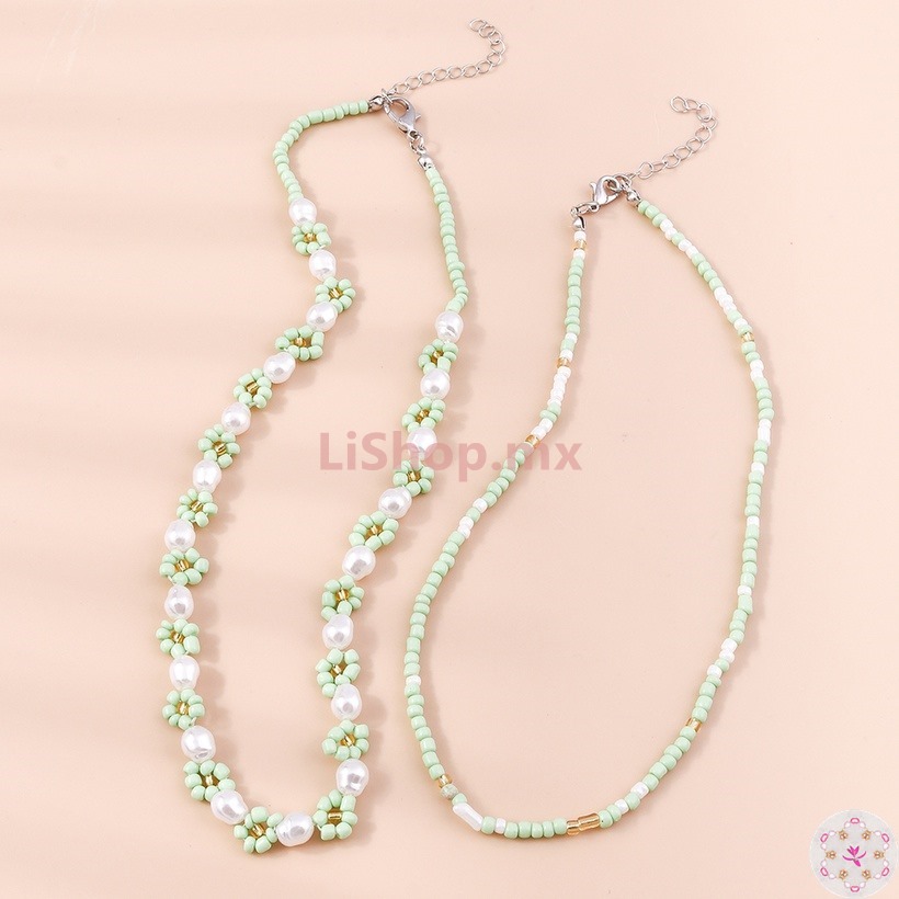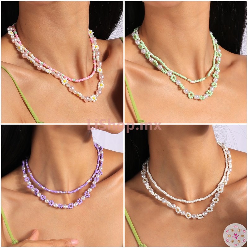 Collar Flor Con Cuentas Perla 2 Piezas